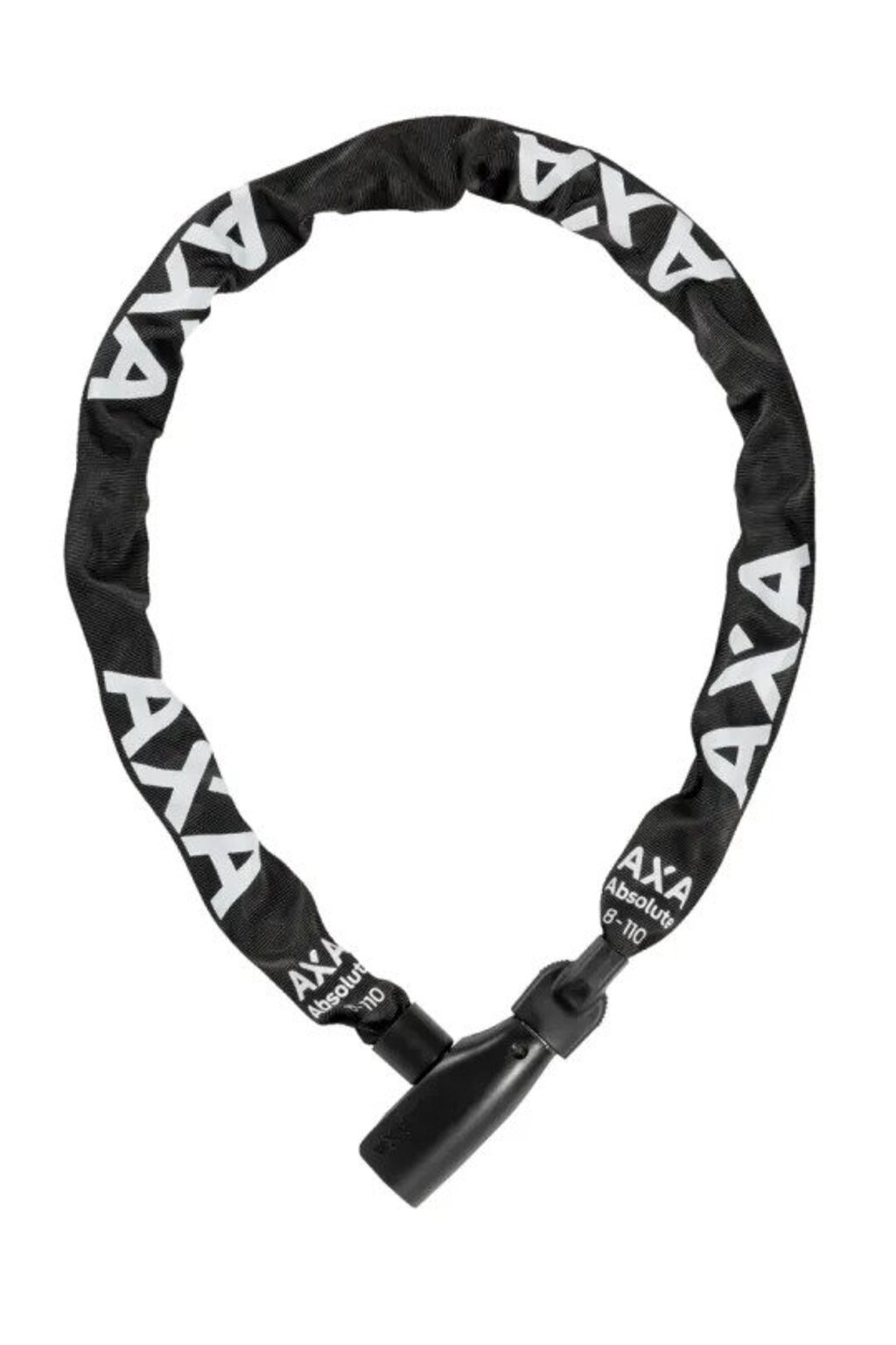 AXA "Absolute" kettingslot SB verpakt, Ø 8 mm, zwart Gehard stalen kettingschakels, roestvrij stalen ontwerpdetails, polyester hoes, 2 sleutels, sleutelservice, slotkop met automatische klikfunctie, cilinder wordt beschermd door een stofkap, AXA veiligheidsindex: 9 (van 15) i.› 110 cm lang, mod. 25